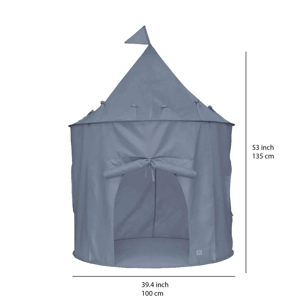 Teltet har et flot spids tag med flag og pynt, 2 net vinduer og 1 dør, der kan rulles op og fastgøres med bindebånd.