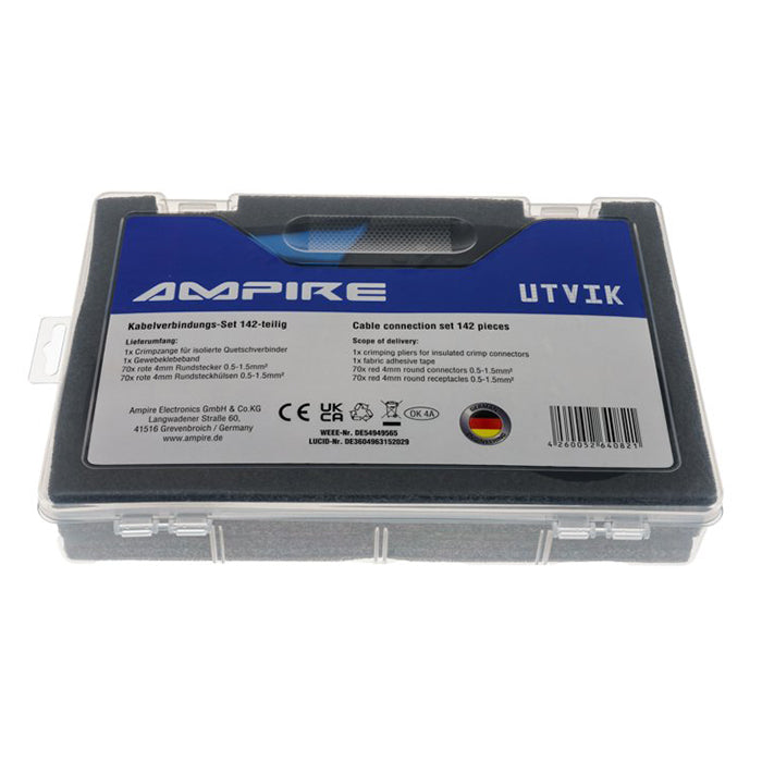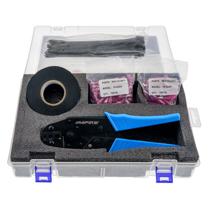 AMPIRE kabelsættet indeholder alt, hvad du behøver for at udføre elinstallationer hurtigt og sikkert. Den medfølgende crimptang sikrer stærke forbindelser, og kabelbindere og tape gør det nemt at organisere og beskytte kabler. Ideel til dig der ønsker en praktisk alt-i-én løsning med høj kvalitet.