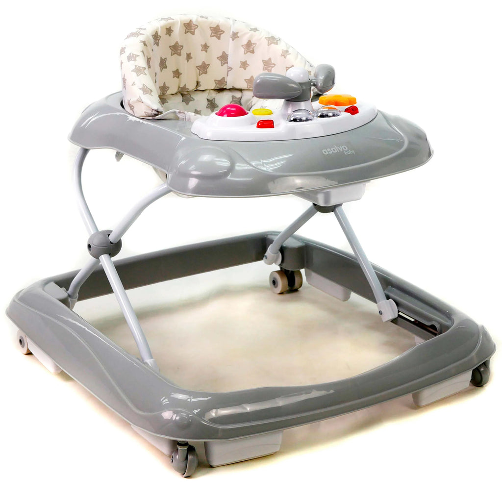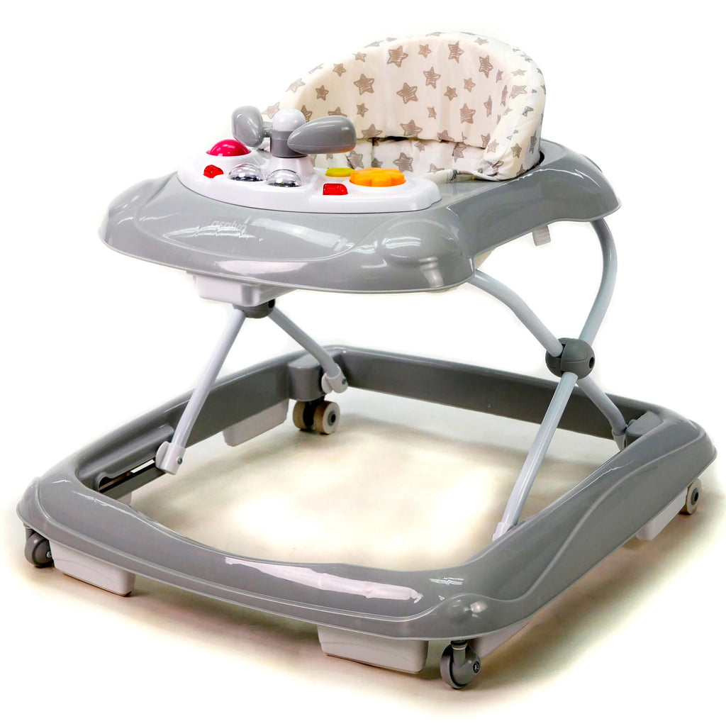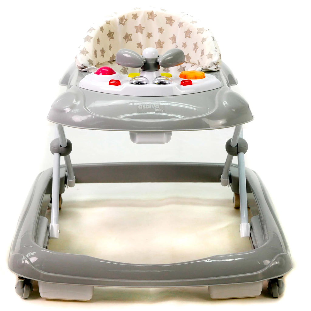 Gåstolen er justerbar i 3 højder, så den kan vokse med dit barn. Aktivitetsdelen er udstyret med legetøj, lys og musik. Der er hjul på undersiden, og bremseklodser, som sikrer at gåstolen blokerer når der er forskel i højden.
