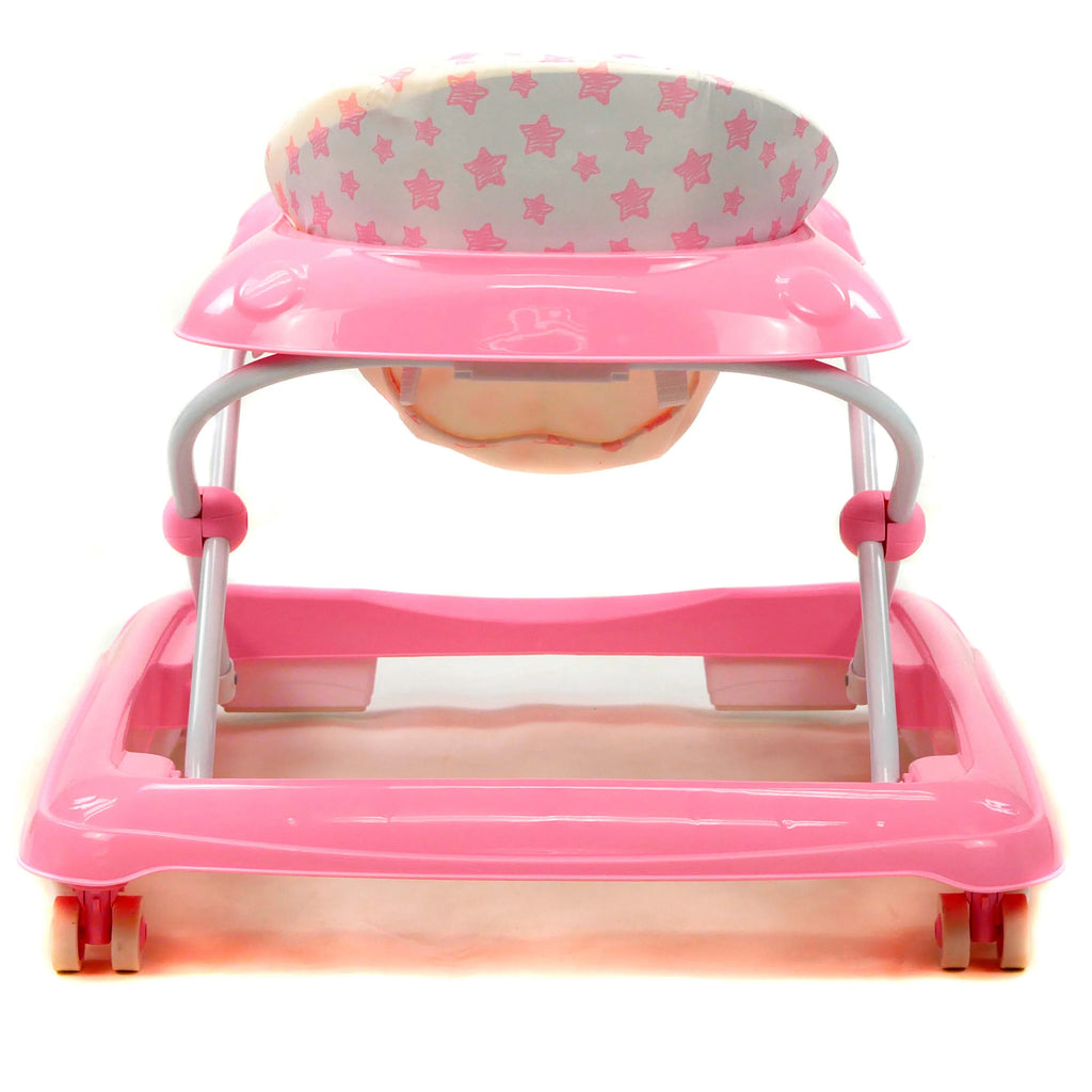 Gåstolen er justerbar i 3 højder, så den kan vokse med dit barn. Aktivitetsdelen er udstyret med legetøj, lys og musik. Der er hjul på undersiden, og bremseklodser, som sikrer at gåstolen blokerer når der er forskel i højden.