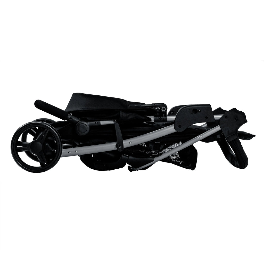 Fin klapvogn med et meget let stålstel og affjedrede hjul, der alle er aftagelige. Forhjul er drejelige