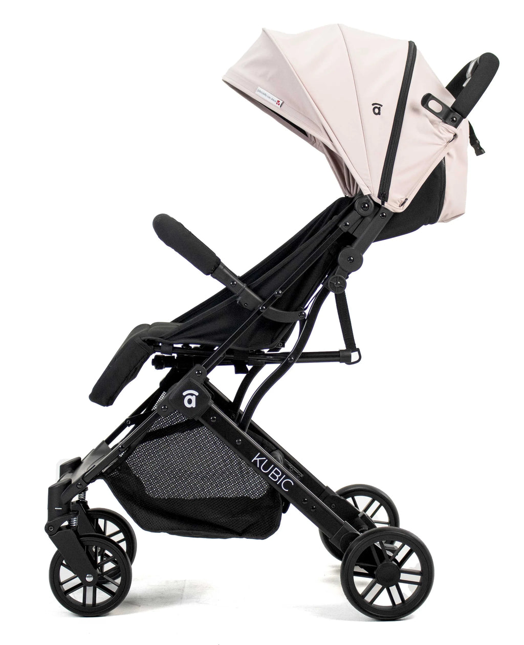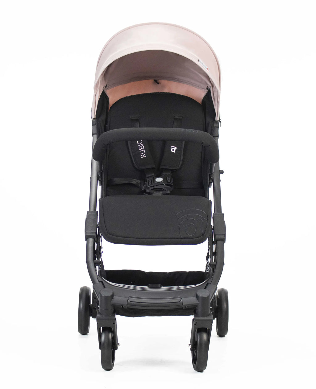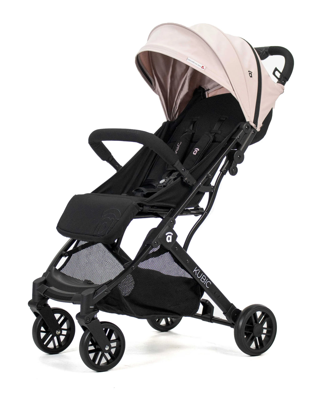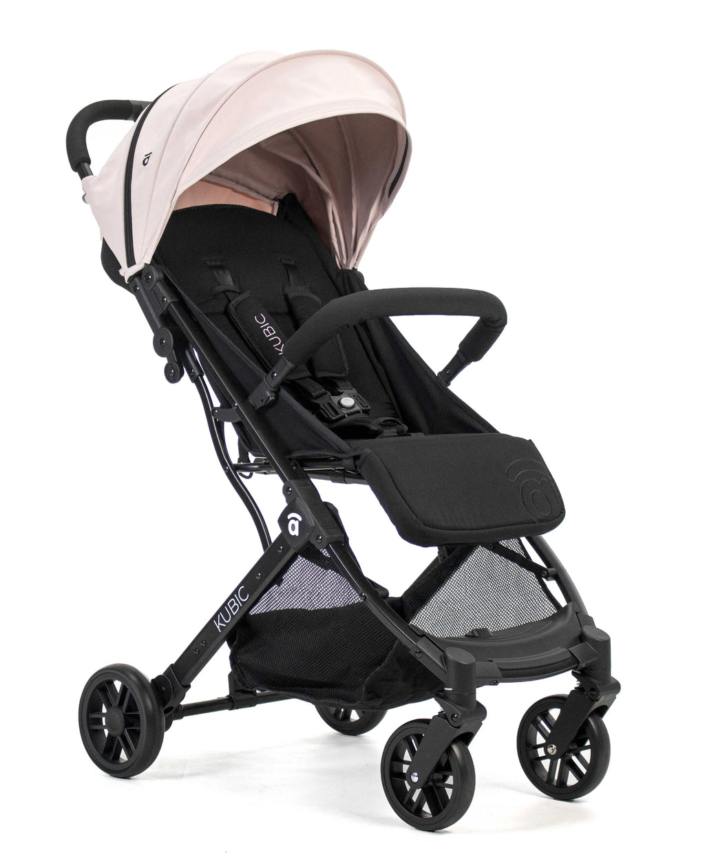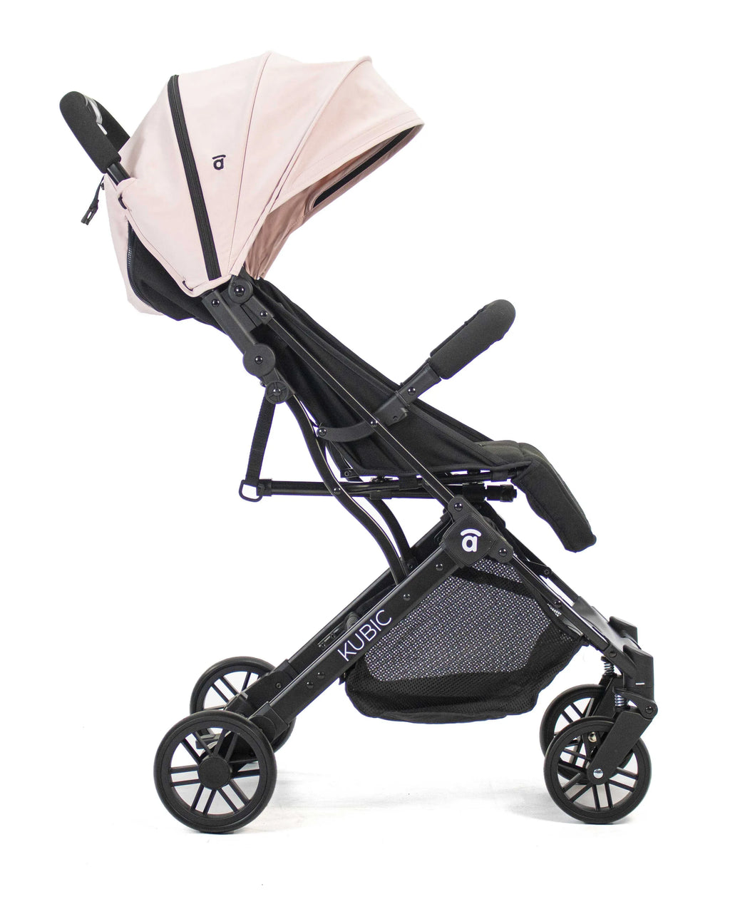 Asalvo Kubic, rosa er en let klapvogn med højkvalitets stretch tekstil, og stort og behageligt polstret sæde.