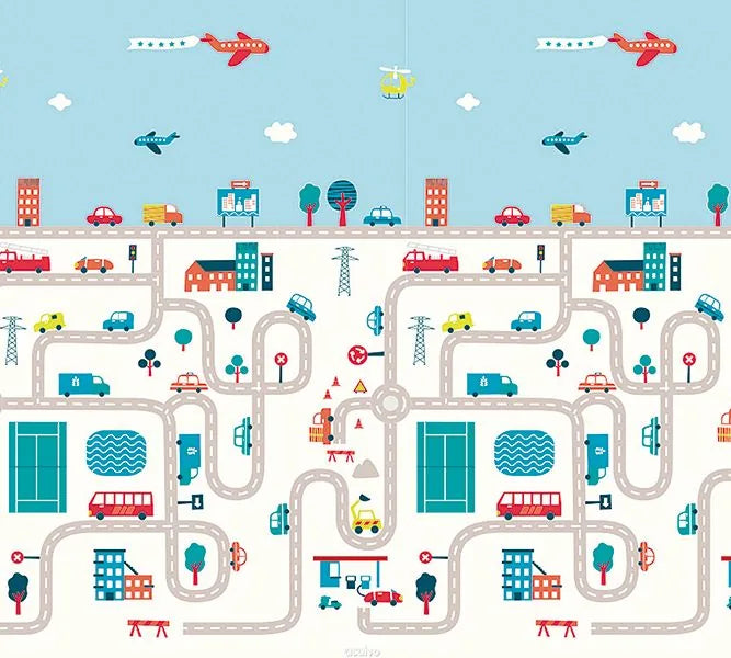 Et stort og foldbart legetæppe, der kan vendes med 2 forskellige illustrationer.