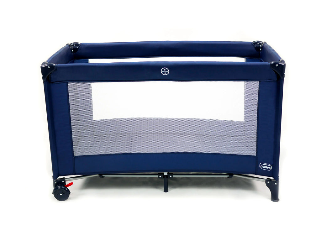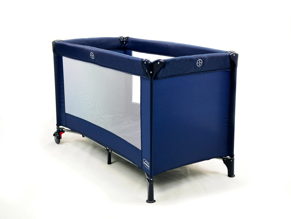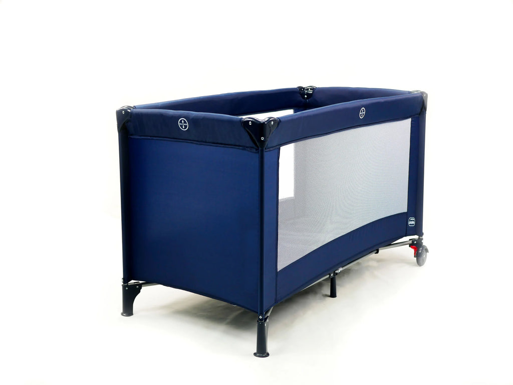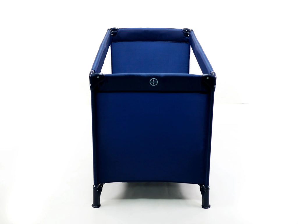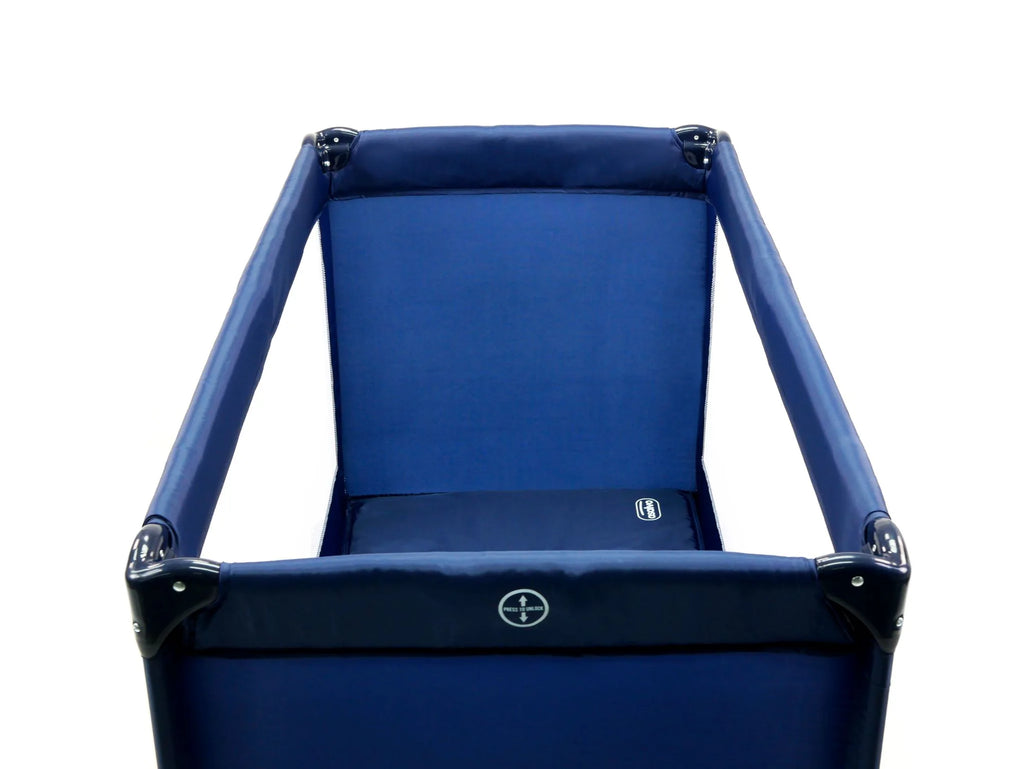 Blå rejseseng der giver stor komfort og sikkerhed for baby på rejser.