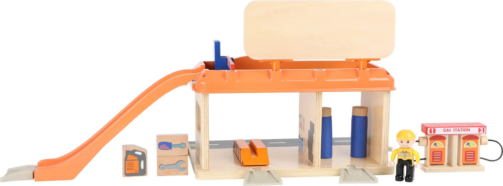 Tankstation og autoværksted i naturligt 100% FSC certificeret træ og robuste plastelementer med vaskehal, mekaniker, taxa, værktøj, lift og bom, der kan spærre for tilkørsel til overetagen.
