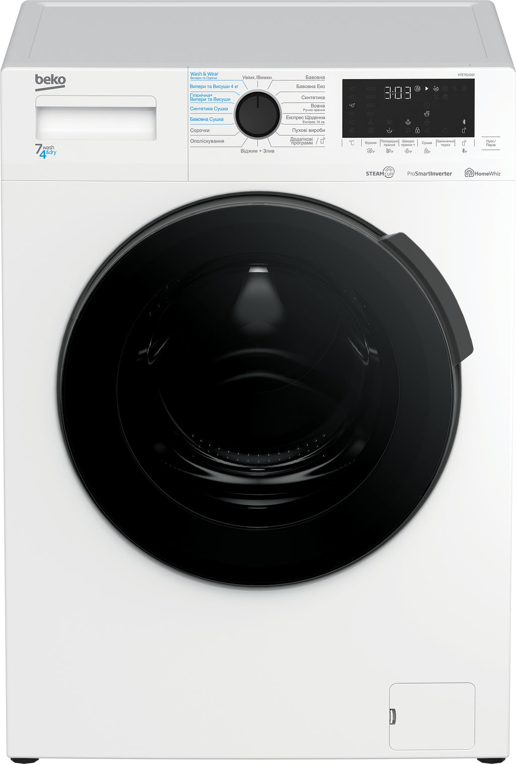 Beko HTE7616X0. Ilægningstype: Front-læsning, Placering af apparat: Fritstående, Produktfarve: Hvid. Tørreevne: 4 kg, Maksimal centrifugeringshastighed: 1200 rpm, Spin-tørre klasse: B. Energieffektivitetsklasse (vask): E, Energieffektivitetsklasse (vask og tørring): D, Vandforbrug pr. vask: 34 L. Dybde: 500 mm, Bredde: 600 mm, Højde: 840 mm
