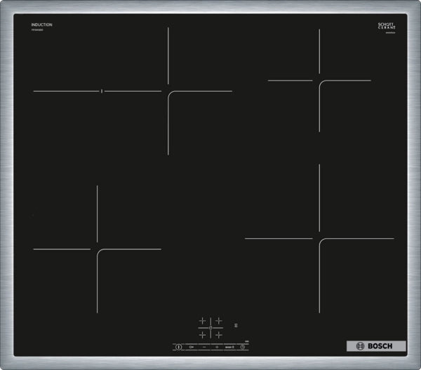 Bosch Serie 4 PIF64RBB5E. Produktfarve: Sort, Placering af apparat: Indbygget, Ovnbredde størrelse: 60 cm. Kontroltype: Berøring, Kontrolposition: Front, Urtype: Elektronisk. Tilsluttet belastning (elektrisk): 7400 W. Bredde: 583 mm, Dybde: 513 mm, Højde: 55 mm