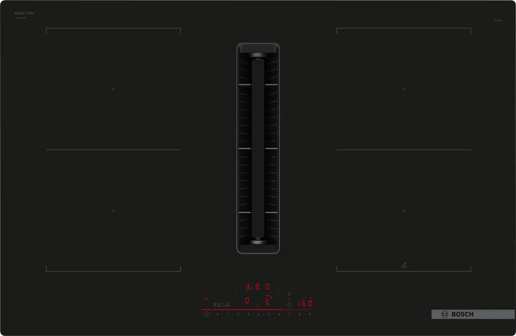 Bosch Serie 6 PVQ811H26E. Produktfarve: Sort, Placering af apparat: Indbygget, Ovnbredde størrelse: 80 cm. Kontroltype: Berøring, Kontrolposition: Front, Timer type: Digital. Ekstraktionstype: Aftræk/Recirkulerende, Maksimal ekstraktionseffekt: 622 m³/t, Støjniveau: 69 dB. Tilsluttet belastning (elektrisk): 7400 W, Vekselstrømsindgangsspænding: 220-240 V, Vekselstrømsindgangsfrekvens: 50-60 Hz. Bosch-teknologier (madlavning): AutoOn, CombiZone, DirectSelect, Home Connect, PerfectFry, PowerBoost