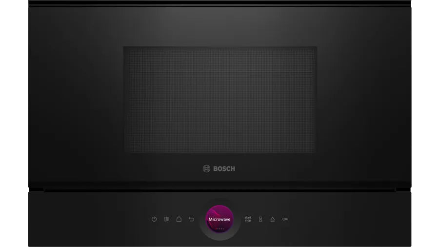 Bosch Serie 8 BFL7221B1. Placering af apparat: Indbygget, Produkttype: Solo mikroovn, Indvendig kapacitet: 21 L, Mikrobølgeeffekt: 900 W, Indbygget skærm, Skærmtype: TFT, Kontroltype: Berøring, Produktfarve: Sort
