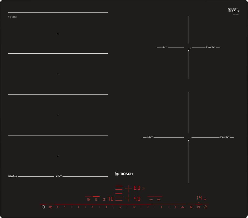 Bosch Serie 8 PXE601DC1E. Produktfarve: Sort, Placering af apparat: Indbygget, Komfurtype: Zone induktionskogeplade. Certificering: AENOR, CE. Kontroltype: Berøring, Kontrolposition: Top forside, Timer type: Digital. Tilsluttet belastning (elektrisk): 7400 W, Vekselstrømsindgangsspænding: 220 - 240 V, Vekselstrømsindgangsfrekvens: 50 - 60 Hz. Bredde: 572 mm, Dybde: 512 mm, Højde: 56 mm