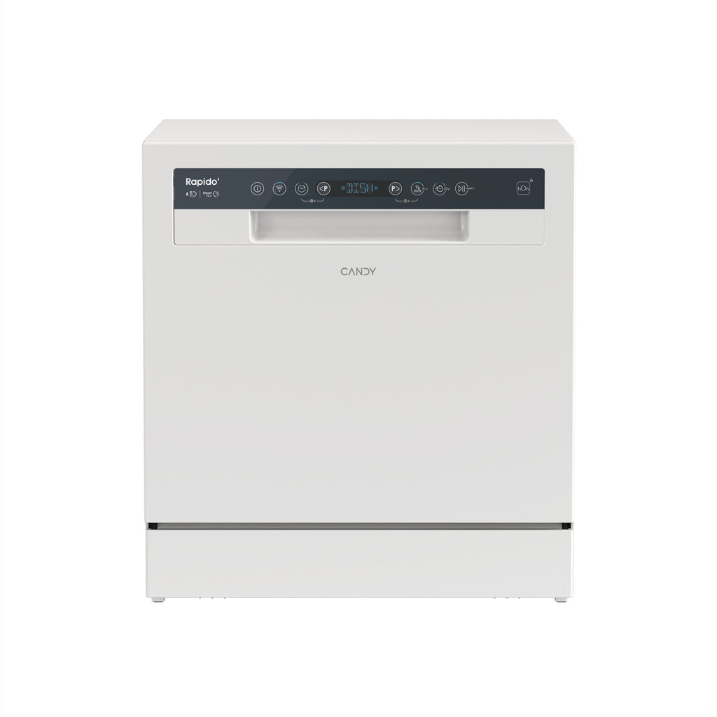 Candy RapidÓ CP 8F9FFW. Placering af apparat: Bordplade, Produktstørrelse: Fuld størrelse (60 cm), Dør farve: Hvid. Antal kuverter: 8 kuverter, Støjemissionsklasse: C, Støjniveau: 49 dB. Kontrol apps understøttes: hOn. Energieffektivitetsklasse: F, Vandforbrug pr. cyklus: 8 L, Energiforbrug pr. 100 cyklusser: 72 kWh. Bredde: 550 mm, Dybde: 501 mm, Højde: 595 mm