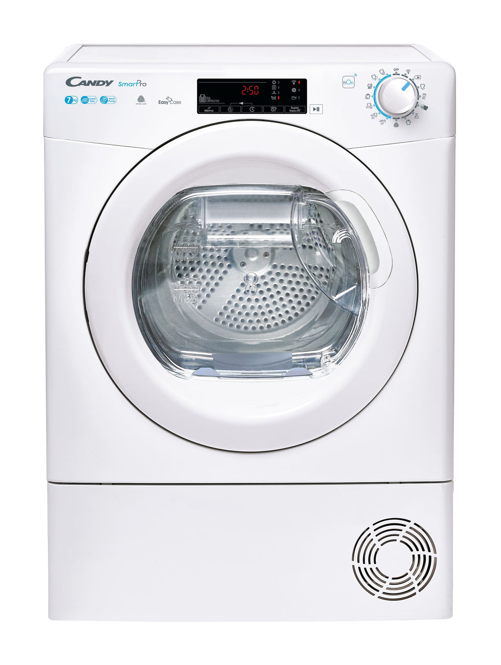 Candy Smart Pro CSOE H7A2TE-S. Placering af apparat: Fritstående, Ilægningstype: Front-læsning, Tørresystem: Varmepumpe. Tromlekapacitet: 7 kg, Condensation efficiency class (old): B, Cyklustid: 202 min.. Forsinket start (maks.): 24 t, Kontrol apps understøttes: hOn. Energiforbrug: 1,72 kWh, Årligt energiforbrug: 211 kWh, Varmekilde: Elektrisk. Dybde: 607 mm, Bredde: 596 mm, Højde: 850 mm