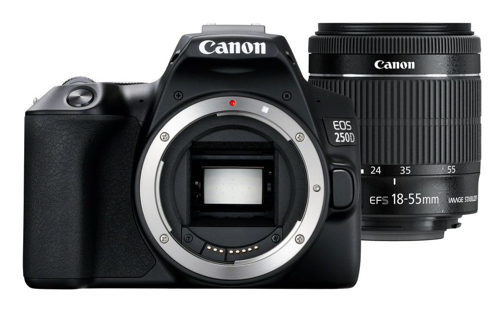 Canon EOS 250D+EF-S 18-55mm. Kameratype: SLR kamerasæt, Megapixel: 24,1 MP, Sensortype: CMOS, Maksimal billedopløsning: 6000 x 4000 pixel. ISO-følsomhed (maks.): 51200. Brændviddeområde: 18 - 55 mm. Wi-Fi. HD-type: 4K Ultra HD, Maksimal videoopløsning: 3840 x 2160 pixel. Skærm diagonal: 7,62 cm (3"), Berøringsskærm. Søgertype: Optisk. PictBridge. Vægt: 449 g. Produktfarve: Sort