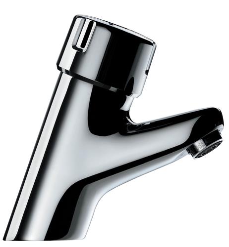 Selvlukkende håndvaske armatur med indbygget vandmængderegulering og temperatur sikkerhedsstop.