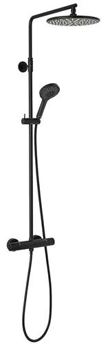 Termostatisk brusesystem med håndbruser og 250 mm hovedbruser i smalt design. Interegret omskifter i termostaten, der også har antiskoldning og Eco Save vandsparefunktion. 1750 mm bruseslange i metal