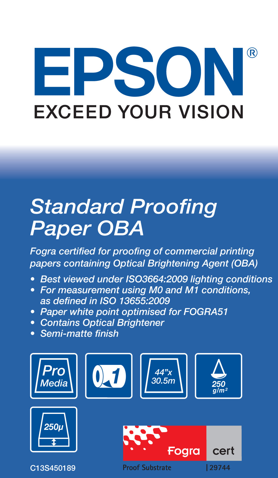 Epson Standard Proofing, 44" x 30.5m, 250 g/m². Rulle, længde: 30,5 m, Størrelse: 111,8 cm (44"), Finish type: Semi-mat, Vægt printer medie: 250 g/m²