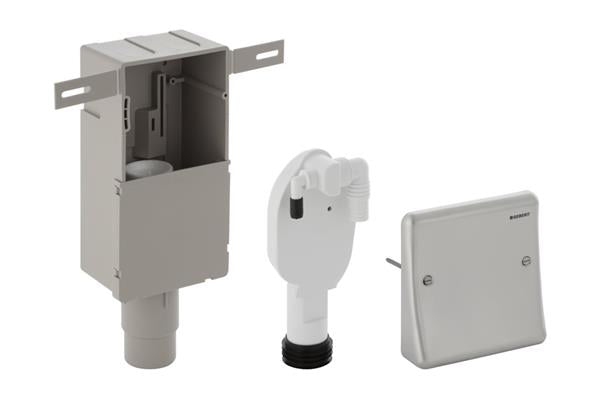 Geberit indbygningsvandlås til enheder, med to tilslutninger, indbygningscisterne og afdækningsplade.