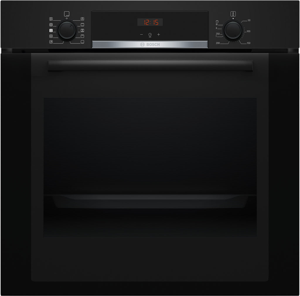 Bosch Serie 4 HQA334EB3. Ovn - størrelse: Medium, Ovntype: Elektrisk ovn, Samlet indvendig ovn kapacitet: 71 L. Placering af apparat: Indbygget, Produktfarve: Sort, Kontroltype: Dreje, Berøring. Timer type: Digital. Energiforbrug (konventionel): 0,94 kWh, Energiforbrug (tvungen konvektion): 0,69 kWh, Energieffektivitetsskala: A+++ til D. Antal lamper: 1 Lampe( r), Lampe type: Halogen