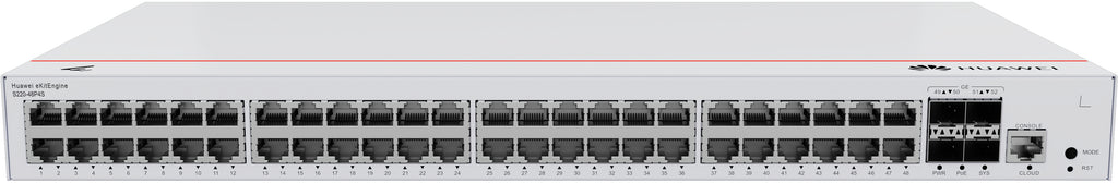 HUAWEI eKit S220 Series S220-48P4S. Switch-type: Administreret, Switch lag: L2. Basis omskiftning RJ-45 Ethernet porttype: Gigabit Ethernet (10/100/1000), Basis omskiftning RJ-45 Ethernet porte, antal: 48, Antal installerede SFP moduler: 4, Port til konsol: RJ-45. MAC adresselabel: 16000 entries, Switch kapacitet: 104 Gbit/sek.. Strøm over Ethernet (PoE). Stativ-montering, Formfaktor: 1U