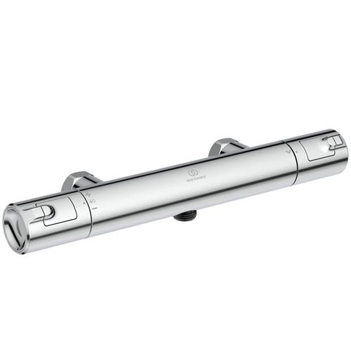 Ideal Standard Ceratherm T50 brusetermostat med betjeningsvenlige vingegreb i metal, overflade: krom, keramisk ventiloverdel, skoldningsspærre, vandsparer, uden forskruninger og rosetter, afg. nedad G1/2" til bruseslange.