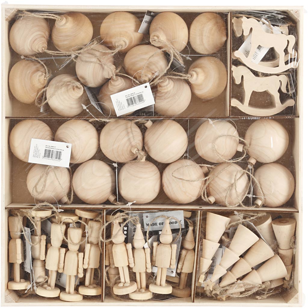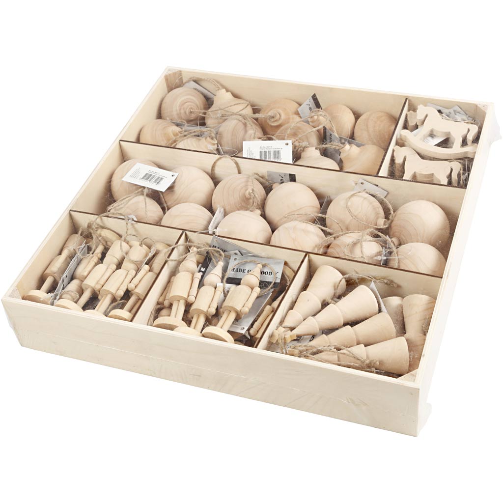 Juleophæng i træ med ophængssnor. Motiver: julekugle, dråbe, 2 forskellige figurer, juletræ samt gyngehest