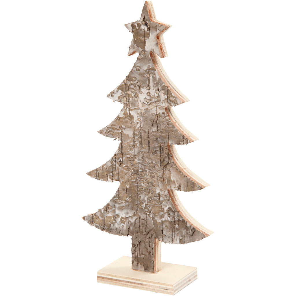 Juletræ i lyst træ dekoreret med bark på den ene side og stående på fod af lyst træ