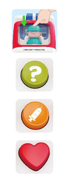 Har tre knapper i forskellige farver til styring af lys- og lydeffekter, advarselssirener, melodier og lyden af hjerteslag. Ambulancen kan køre både med og uden udrykning/musik!