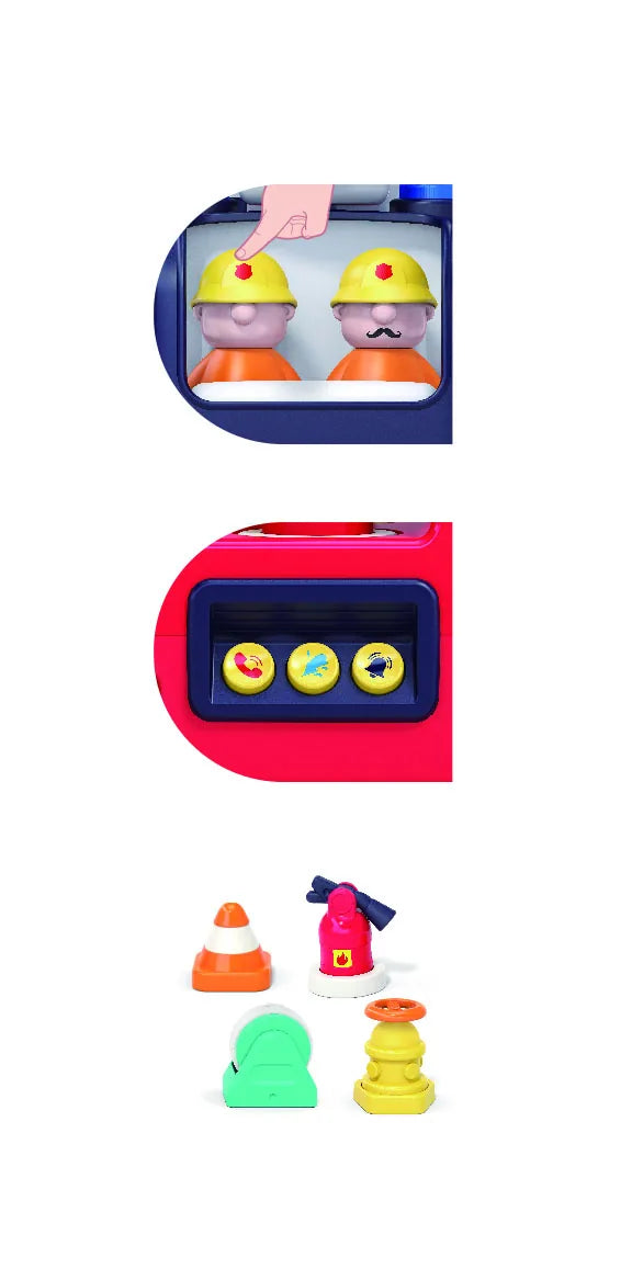 4 brandslukningsværktøjer med lydeffekter, der kan tages ud separat. Udtrækkelig stige som kan justeres i forhold til længde, højde og retning.