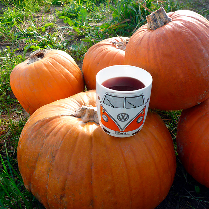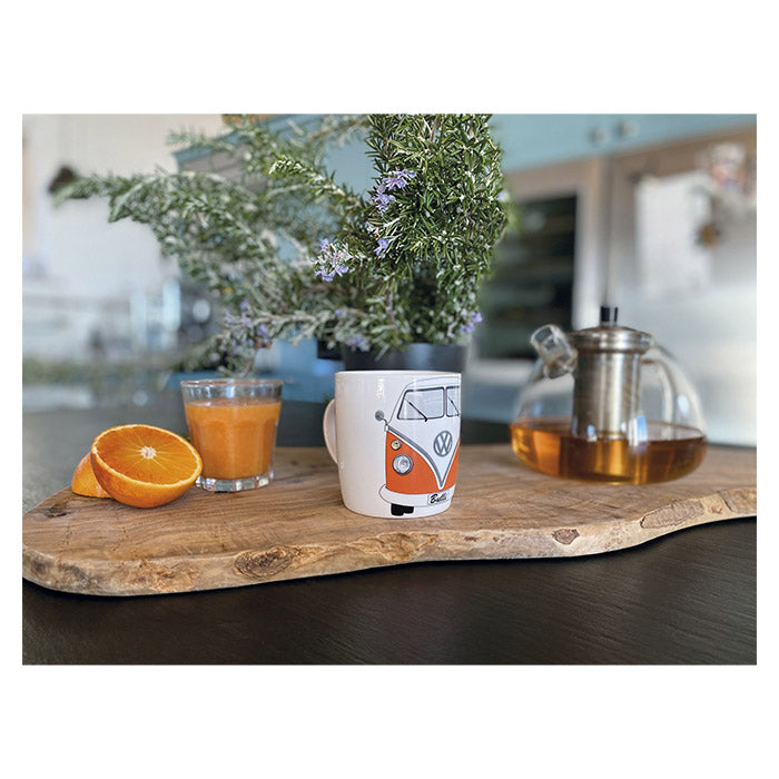 Oplev nostalgi med vores orange krus prydet med et ikonisk print af den klassiske VW T1 bus. Dette krus er perfekt til både kaffe og te, og dets unikke design vil bringe et smil på læben hver morgen.