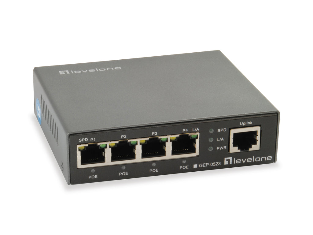 LevelOne GEP-0523. Basis omskiftning RJ-45 Ethernet porttype: Gigabit Ethernet (10/100/1000), Basis omskiftning RJ-45 Ethernet porte, antal: 5. MAC adresselabel: 8000 entries. Netværksstandarder: IEEE 802.3, IEEE 802.3ab, IEEE 802.3af, IEEE 802.3at, IEEE 802.3u, IEEE 802.3x. DC indgangsspænding: 52 - 57 V. Strøm over Ethernet (PoE)