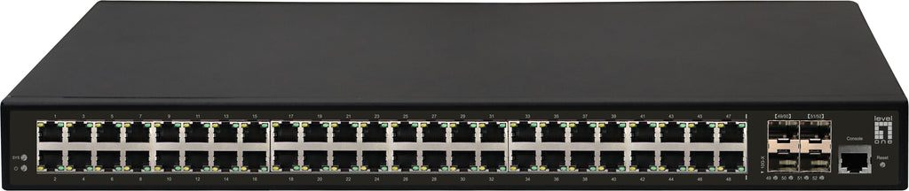LevelOne GTL-5291. Switch-type: Administreret, Switch lag: L3. Basis omskiftning RJ-45 Ethernet porttype: Gigabit Ethernet (10/100/1000), Basis omskiftning RJ-45 Ethernet porte, antal: 48, Port til konsol: RJ-45. MAC adresselabel: 8000 entries. Netværksstandarder: IEEE 802.1D, IEEE 802.1Q, IEEE 802.1s, IEEE 802.1w, IEEE 802.3, IEEE 802.3ab, IEEE 802.3u, IEEE.... Strømstik: AC-in jack. Stativ-montering, Formfaktor: 1U