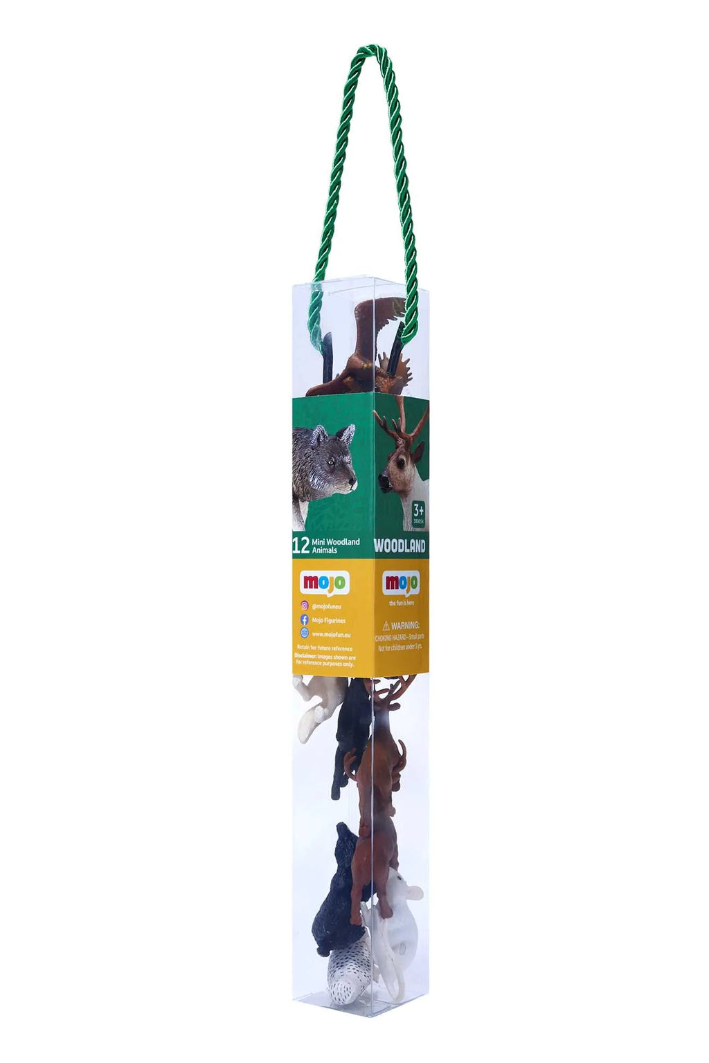 Gennemsigtig firkantet plastrør med hank fyldt med 12 flotte vilde skov dyr.