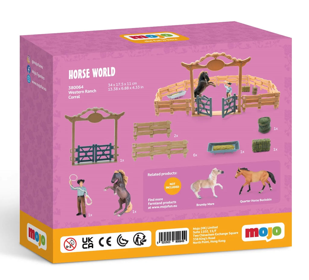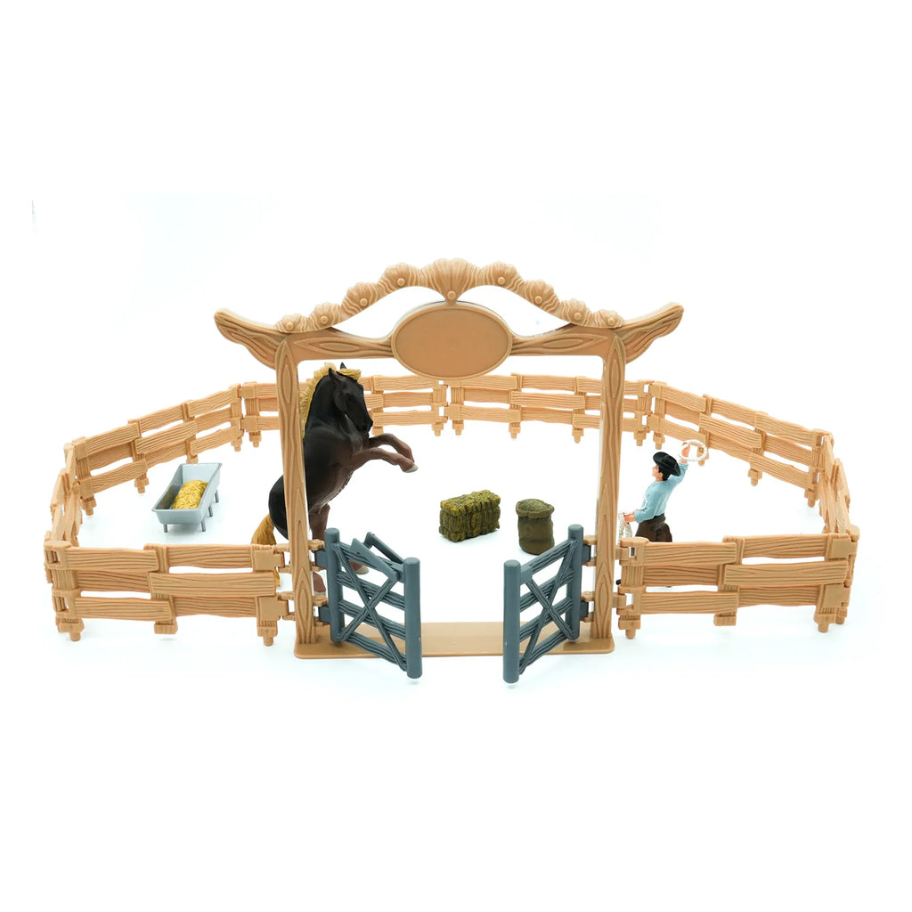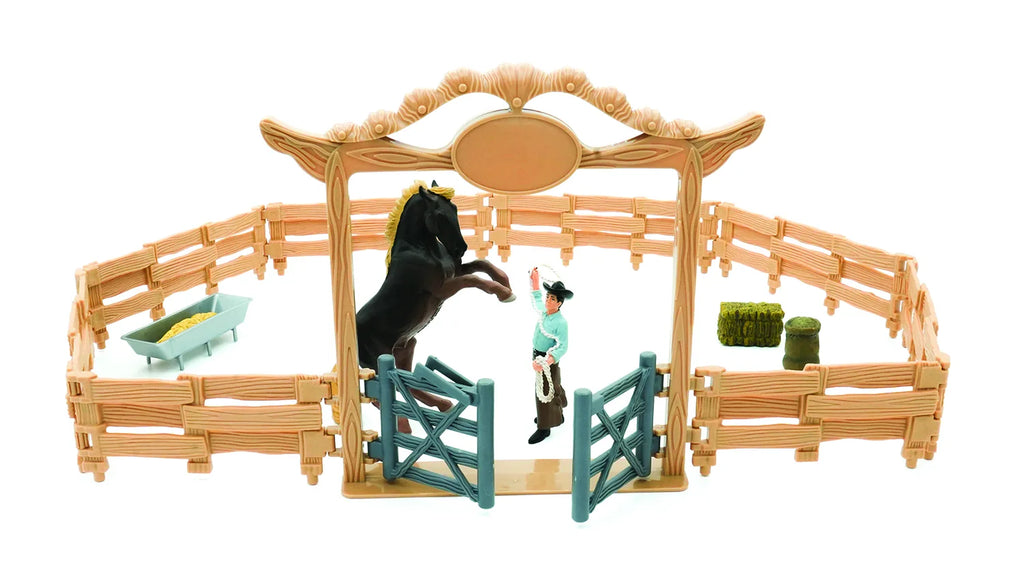 Der medfølger 1 cowboy med lasso, 1 hest, 1 indgang med låger, 8 hegn, 1 fodertrug, 1 halmballe og 1 spand havre.