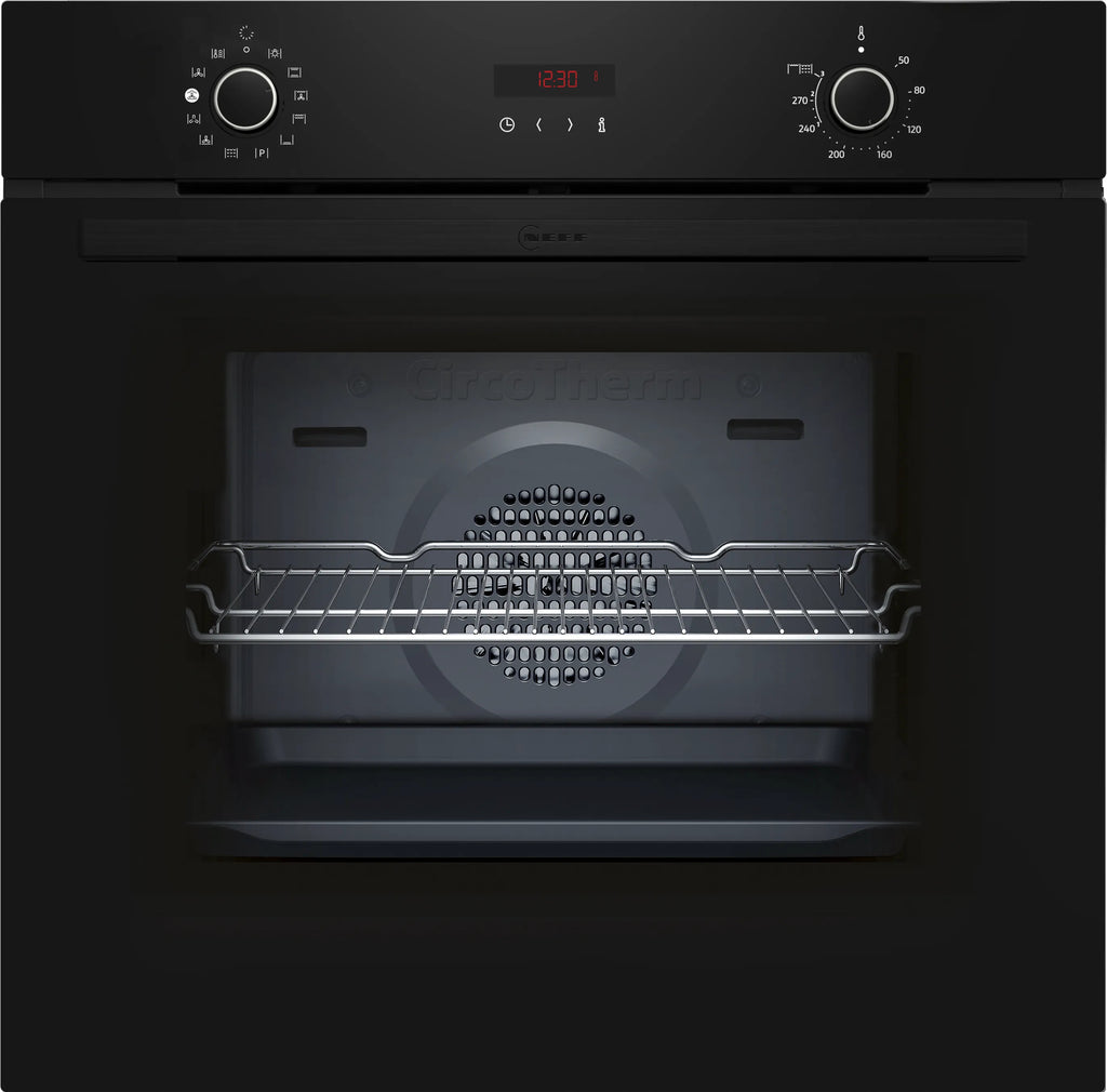 Neff N 30 B2CVG6AK3. Ovn - størrelse: Medium, Ovntype: Elektrisk ovn, Samlet indvendig ovn kapacitet: 71 L. Placering af apparat: Indbygget, Produktfarve: Sort, Kontroltype: Dreje. Urtype: Elektronisk. Energieffektivitetsklasse: A+, Energiforbrug (konventionel): 0,94 kWh, Energiforbrug (tvungen konvektion): 0,69 kWh. Antal lamper: 1 Lampe( r), Lampe type: Halogen