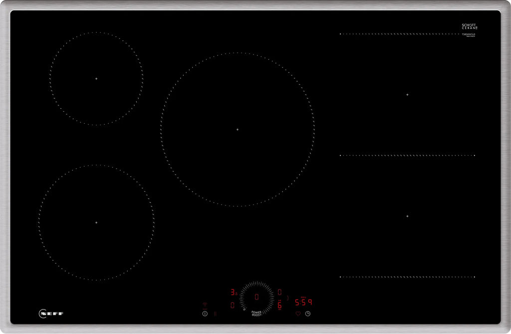 Neff T58SHW1L0. Produktfarve: Sort, Rustfrit stål, Placering af apparat: Indbygget, Ovnbredde størrelse: 80 cm. Kontroltype: Berøring, Kontrolposition: Top forside, Urtype: Elektronisk. Tilsluttet belastning (elektrisk): 7400 W, Vekselstrømsindgangsspænding: 220-240 V, Vekselstrømsindgangsfrekvens: 50/60 Hz. NEFF-teknologier (madlavning): Home Connect. Bredde: 802 mm, Dybde: 523 mm, Højde: 55 mm