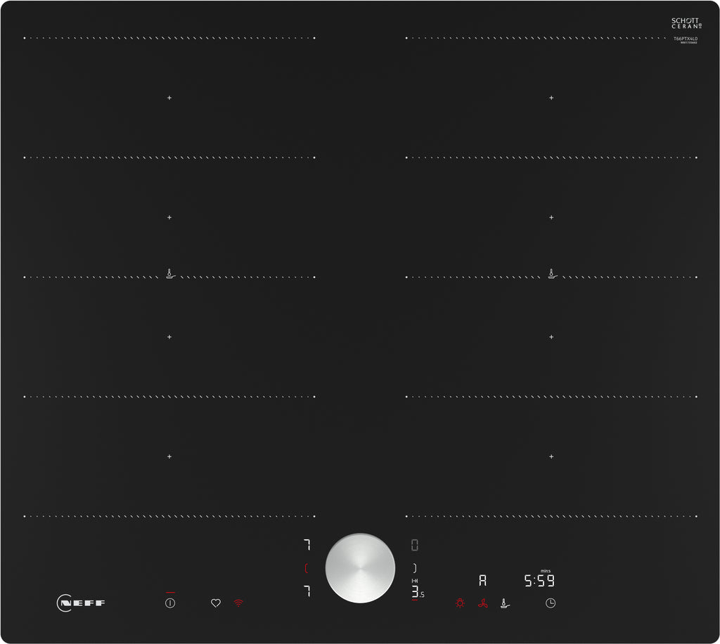 Neff T66PTX4L0. Produktfarve: Sort, Placering af apparat: Indbygget, Ovnbredde størrelse: 60 cm. Kontroltype: Berøring, Kontrolposition: Front, Urtype: Elektronisk. Tilsluttet belastning (elektrisk): 7400 W, Vekselstrømsindgangsspænding: 220 - 240 V, Vekselstrømsindgangsfrekvens: 50/60 Hz. Bredde: 572 mm, Dybde: 512 mm, Højde: 56 mm. Pakkebredde: 753 mm, Pakkedybde: 608 mm, Pakkehøjde: 126 mm