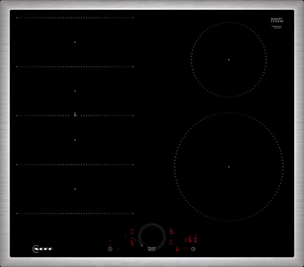 Neff T66SHE4L0. Produktfarve: Sort, Rustfrit stål, Placering af apparat: Indbygget, Ovnbredde størrelse: 60 cm. Kontroltype: Berøring, Kontrolposition: Front, Timer type: Digital. Tilsluttet belastning (elektrisk): 7400 W, Vekselstrømsindgangsspænding: 220 - 240 V. Bredde: 583 mm, Dybde: 513 mm, Højde: 55 mm. Pakkebredde: 753 mm, Pakkedybde: 608 mm, Pakkehøjde: 126 mm