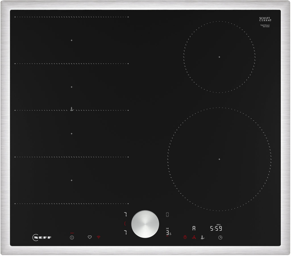 Neff T66STE4L0. Produktfarve: Sort, Rustfrit stål, Placering af apparat: Indbygget, Ovnbredde størrelse: 60 cm. Certificering: AENOR, CE. Kontroltype: Dreje, Berøring, Kontrolposition: Top forside, Timer type: Digital. Tilsluttet belastning (elektrisk): 7400 W, Vekselstrømsindgangsspænding: 220 - 240 V, Vekselstrømsindgangsfrekvens: 50/60 Hz. Bredde: 583 mm, Dybde: 513 mm, Højde: 55 mm