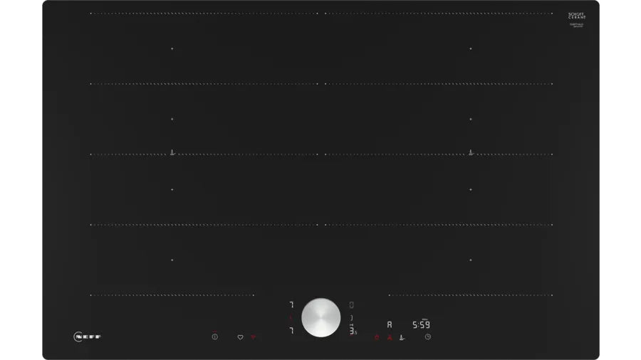Neff T68PTY4L0. Produktfarve: Sort, Placering af apparat: Indbygget, Ovnbredde størrelse: 80 cm. Kontroltype: Dreje, Berøring, Kontrolposition: Front, Urtype: Elektronisk. Tilsluttet belastning (elektrisk): 7400 W, Vekselstrømsindgangsspænding: 220-240 V, Vekselstrømsindgangsfrekvens: 50/60 Hz. NEFF-teknologier (madlavning): Home Connect. Bredde: 792 mm, Dybde: 512 mm, Højde: 56 mm