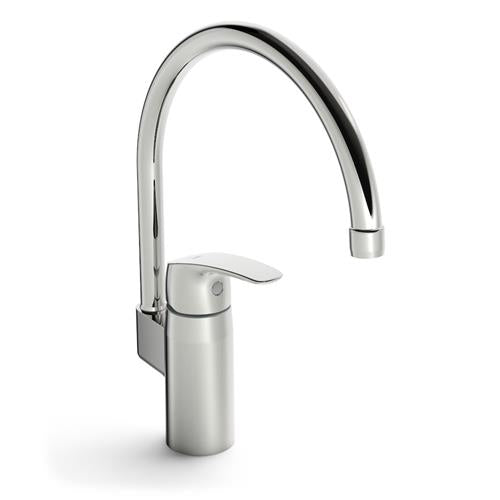 Køkkenarmatur med høj svingtud. Svingradius er 120° som standard (kan begrænses til 0°- 60°). Der er mulighed for, at begrænse flow og temperatur på armaturets kartouche. F = fleksible tilslutningsslanger. Forkromet.