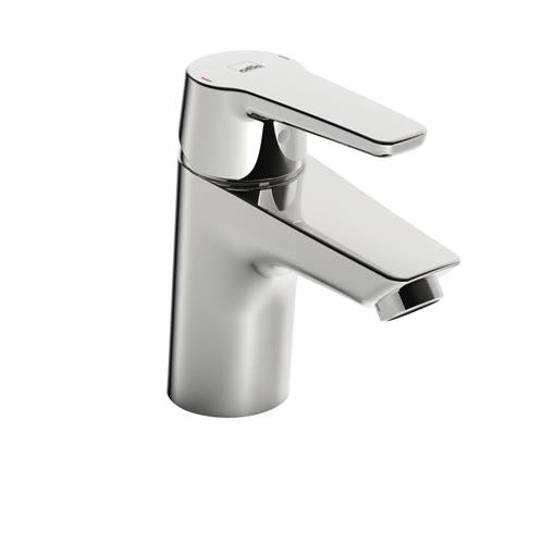 Håndvaskarmatur uden bundventil. Armaturet er udført i et slankt, strømlinet design, der passer ind på de fleste badeværelser. Mængdebegrænset til 6 l/min. Mulighed for begrænsning af temperatur og vandmængde. F = fleksible tilslutningsslanger. Forkromet.