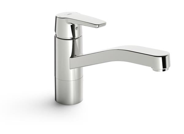 Køkkenarmatur med lav svingtud. Tudens svingradius er forindstillet til 120° (kan begrænses til 40°-80°). Mulighed for begrænsning af temperatur og vandmængde på den keramiske kartouche. F = fleksible tilslutningsslanger. Forkromet.
