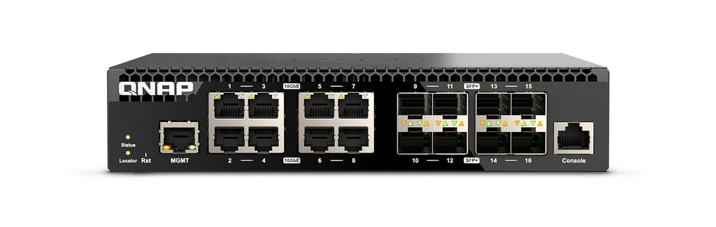 QNAP QSW-M3216R-8S8T. Switch-type: Administreret, Switch lag: L2/L3. Basis omskiftning RJ-45 Ethernet porttype: 10G Ethernet (100/1000/10000), Basis omskiftning RJ-45 Ethernet porte, antal: 8, Antal installerede SFP+ moduler: 8, Port til konsol: RJ-45. MAC adresselabel: 16000 entries, Switch kapacitet: 320 Gbit/sek.. Netværksstandarder: IEEE 802.3, IEEE 802.3ab, IEEE 802.3ae, IEEE 802.3p, IEEE 802.3u, IEEE 802.3x, IEEE 802.3z. Stativ-montering, Formfaktor: 1U