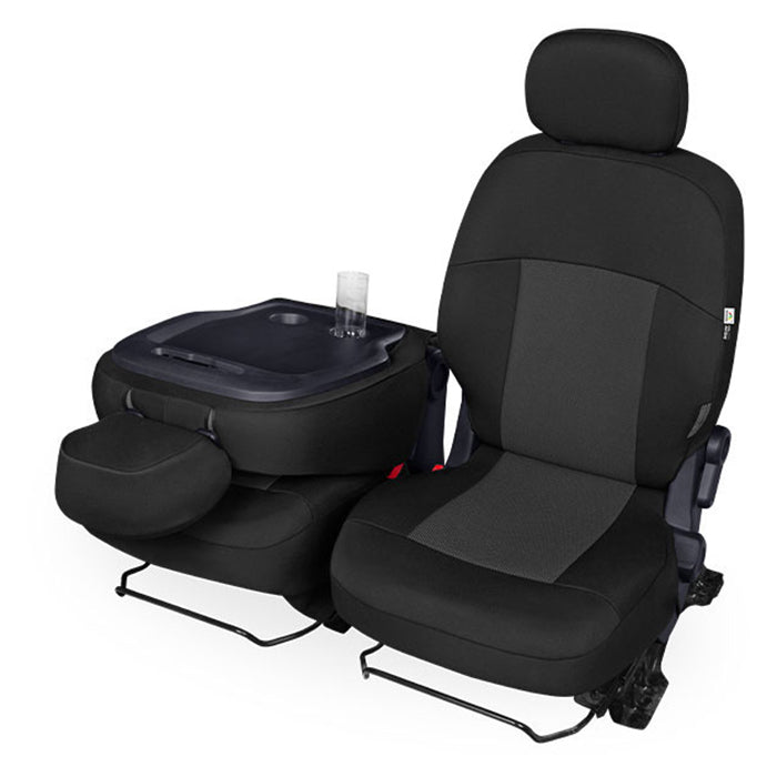Den afdæmpede farvekombination af sort med en diskret grå tekstur passer perfekt ind i enhver bilindretning. En af de store fordele ved disse betræk er, at de dækker hele bagsiden af ryglænet, hvilket sikrer en fuld beskyttelse.