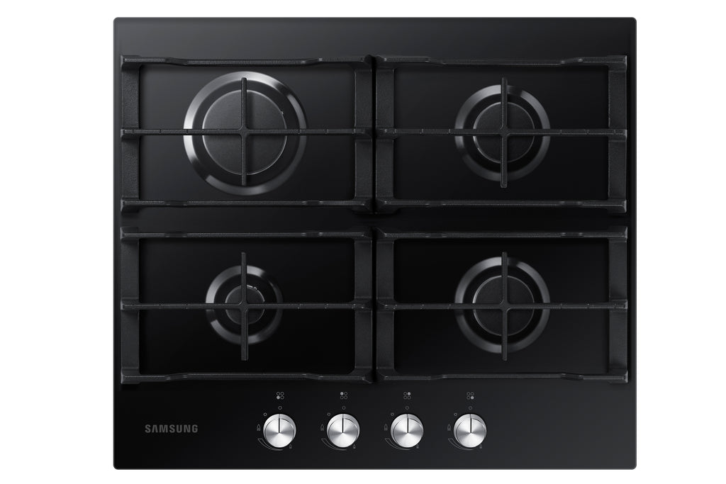 Samsung NA64H3010AK. Produktfarve: Sort, Placering af apparat: Indbygget, Ovnbredde størrelse: 60 cm. Simre kogeplade / madlavningsområde: 1000 W, Almindelige kogeplade / madlavningsområde: 2000 W, Stor kogeplade / madlavningsområde: 3300 W. Kontroltype: Dreje, Kontrolposition: Top forside. Tilsluttet belastning (gas): 8300 W. Bredde: 600 mm, Dybde: 520 mm, Højde: 98 mm
