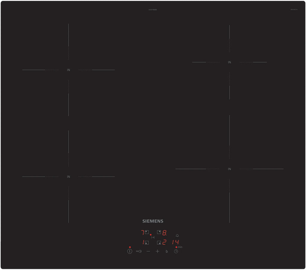 Siemens iQ100 EU611BEB5H. Produktfarve: Sort, Placering af apparat: Indbygget, Ovnbredde størrelse: 60 cm. Kontroltype: Berøring, Kontrolposition: Front / Top front, Timer type: Digital. Tilsluttet belastning (elektrisk): 4600 W, Vekselstrømsindgangsspænding: 220-240 V, Vekselstrømsindgangsfrekvens: 50/60 Hz. Siemens-teknologier (madlavning): quickStart, quickStop, reStart. Bredde: 592 mm, Dybde: 522 mm, Højde: 51 mm