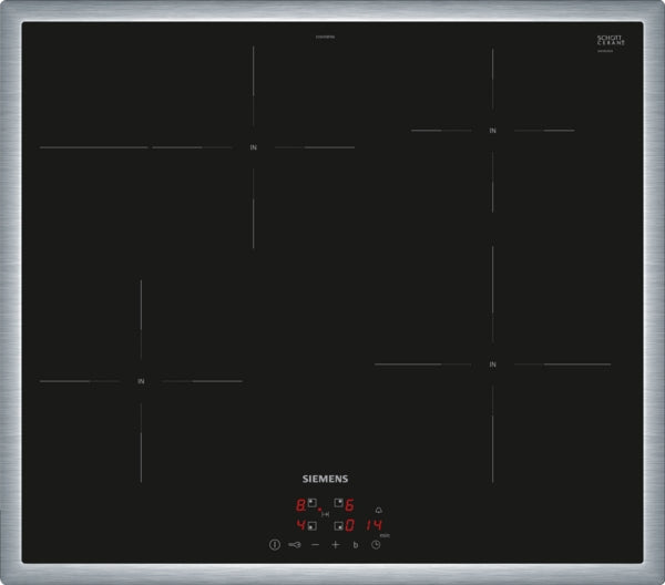 Siemens iQ300 EH645BFB6E. Produktfarve: Sort, Rustfrit stål, Placering af apparat: Indbygget, Ovnbredde størrelse: 60 cm. Kontroltype: Berøring, Kontrolposition: Top forside, Timer type: Digital. Tilsluttet belastning (elektrisk): 7400 W, Vekselstrømsindgangsspænding: 220 - 240 V, Vekselstrømsindgangsfrekvens: 50/60 Hz. Bredde: 583 mm, Dybde: 513 mm, Højde: 55 mm. Pakkebredde: 753 mm, Pakkedybde: 608 mm, Pakkehøjde: 126 mm