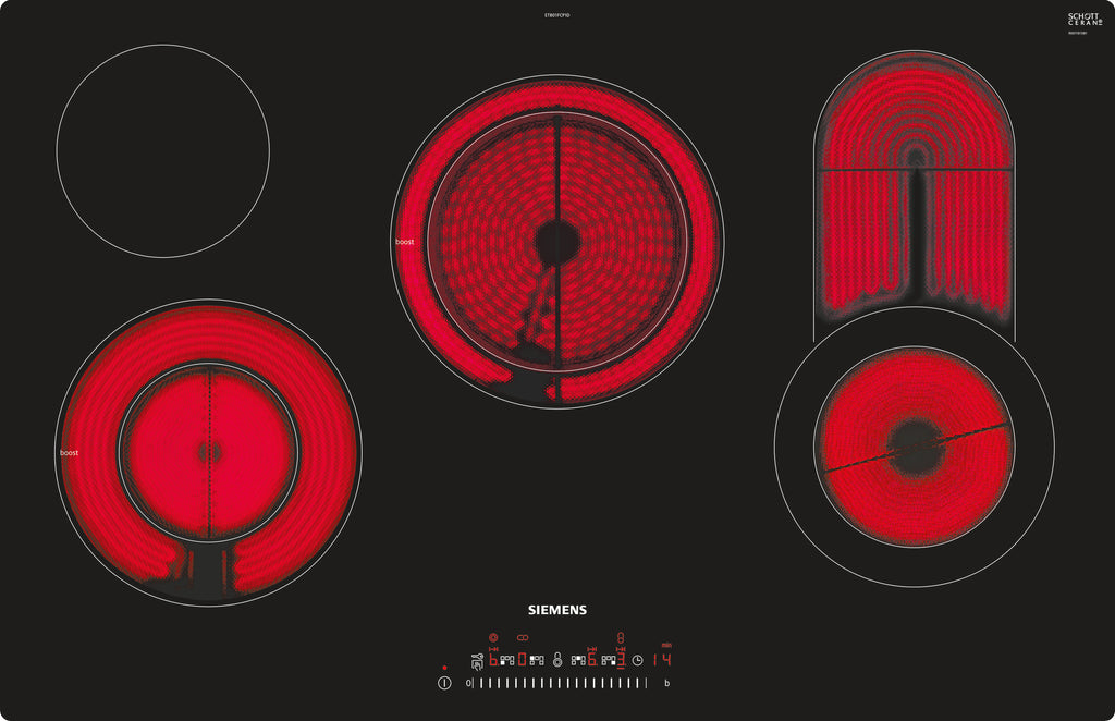 Siemens ET801FCP1D. Produktfarve: Sort, Rustfrit stål, Placering af apparat: Indbygget, Komfurtype: Keramisk. Simre kogeplade / madlavningsområde: 1200 W, Almindelige kogeplade / madlavningsområde: 2100 W, Stor kogeplade / madlavningsområde: 2400 W. Kontroltype: Berøring, Kontrolposition: Top forside. Tilsluttet belastning (elektrisk): 9300 W, Vekselstrømsindgangsspænding: 220-240 V, Vekselstrømsindgangsfrekvens: 50 - 60 Hz. Bredde: 792 mm, Dybde: 512 mm, Højde: 51 mm