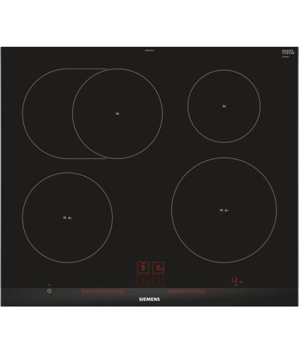 Siemens EH675LFC1E. Produktfarve: Sort, Rustfrit stål, Placering af apparat: Indbygget, Komfurtype: Zone induktionskogeplade. Simre kogeplade / madlavningsområde: 2200 W, Almindelige kogeplade / madlavningsområde: 3100 W, Stor kogeplade / madlavningsområde: 3700 W. Kontroltype: Berøring, Kontrolposition: Top forside, Skærmtype: LED. Tilsluttet belastning (elektrisk): 7400 W, Vekselstrømsindgangsspænding: 220-240 V, Vekselstrømsindgangsfrekvens: 50 - 60 Hz. Bredde: 602 mm, Dybde: 520 mm, Højde: 51 mm