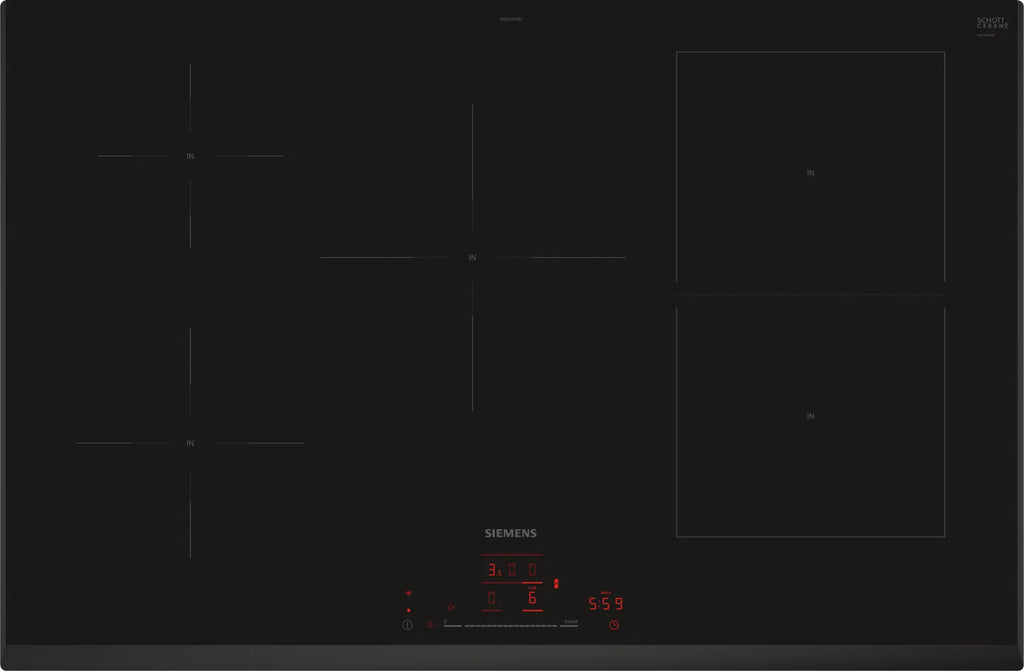 Siemens iQ500 ED851HWB1E. Produktfarve: Sort, Placering af apparat: Indbygget, Ovnbredde størrelse: 80 cm. Kontroltype: Berøring, Kontrolposition: Top forside, Timer type: Digital. Tilsluttet belastning (elektrisk): 7400 W, Vekselstrømsindgangsspænding: 220 - 240 V, Vekselstrømsindgangsfrekvens: 50 - 60 Hz. Kontrol apps understøttes: Home Connect. Siemens-teknologier (madlavning): combiZone, cookConnect, quickStart, touchSlider